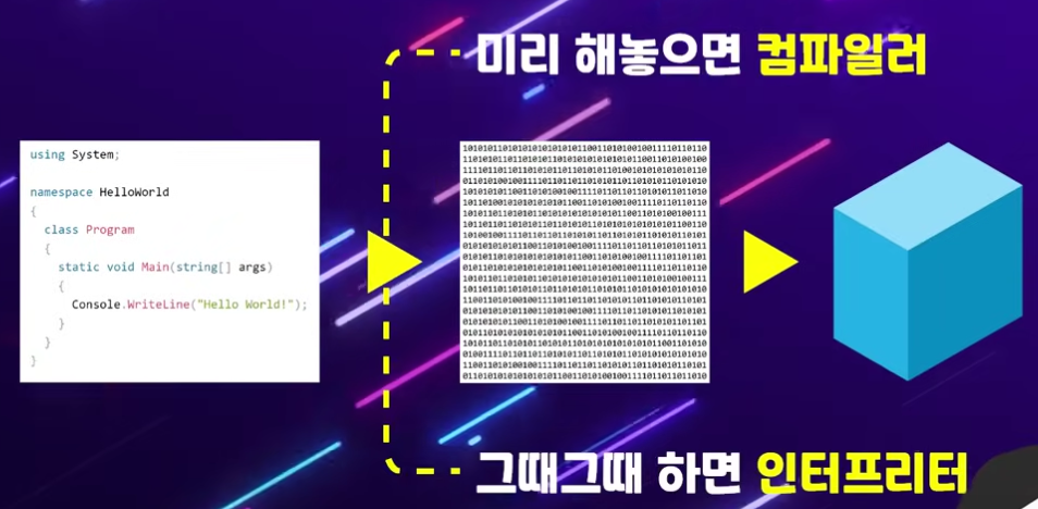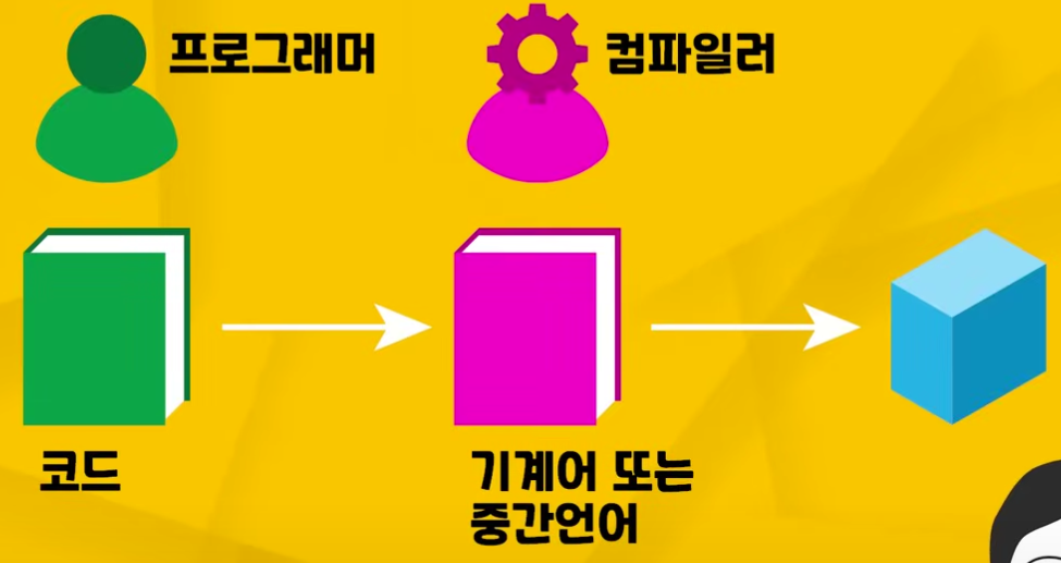 컴파일러라고 불리는 번역가(프로그램)가 컴퓨터에게 건네줄 책을 미리 컴퓨터의 언어로 번역 작업을 하는 것.