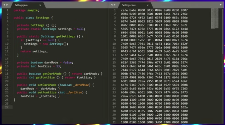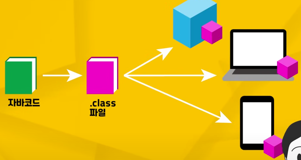이 class 파일은 자바 가상 머신(JVM)이라는 프로그램이 설치된 모든 종류의 기계에서 통용되는 기계언어이다.