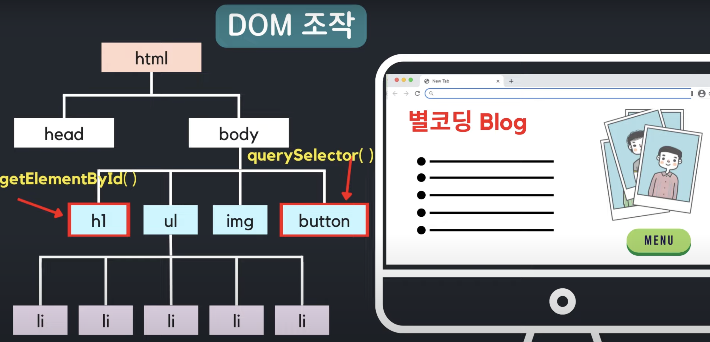 만약 왼쪽에 있는 내용을 가지고 있는 웹페이지를 오른쪽처럼 이런 식으로 수정을 하고싶다면 우리는 아래와 같이 자바스크립트 코드를 짜서 DOM을 조작하면 된다.