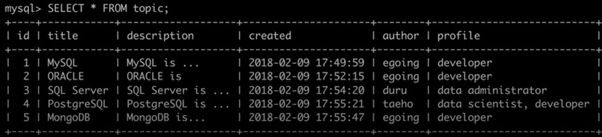 ex: topic이라는 테이블의 id, title, created, author 컬럼의 데이터를 불러오고 싶으면